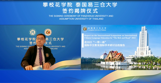 参加签约挂牌仪式的还有泰国易三仓大学注册部、国际合作办公室相关负责人,我校国际交流与合作处、文学院、科研处相关负责人和教师代表。