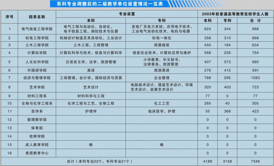 2004年6月,学校进行第一次学科专业调整,将原来11个教学单位调整为8个二级学院、5个系(部)和技师学院、成人教育学院(自学考试办公室)、素质教育中心共16个教学单位。