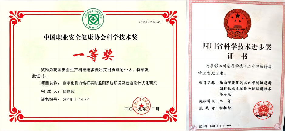 2019年2月,我校《数字化测力锚杆实时监测系统研发及巷道设计优化研究》成果获中国职业安全健康协会科学技术奖一等奖,实现了以第一单位获得国家奖励办认定的社会力量设立的科学技术奖一等奖的“零”突破。2022年3月,《面向智能化的热轧带肋钢筋新国标低成本制造关键创新技术与示范》成果获四川省科学技术进步奖二等奖,实现了以第一单位获得省科学技术进步奖二等奖的“零”突破。