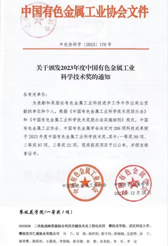 近日,中国有色金属工业协会颁布了2023年科学技术奖获奖名单,由我校钒钛学院马兰教授牵头,以下载香港宝典2021为第一完成单位,与武汉科技大学、攀枝花仁通钒业联合完成的《二次钒战略资源综合利用关键技术及工程化应用》荣获中国有色金属工业科学技术进步奖一等奖。