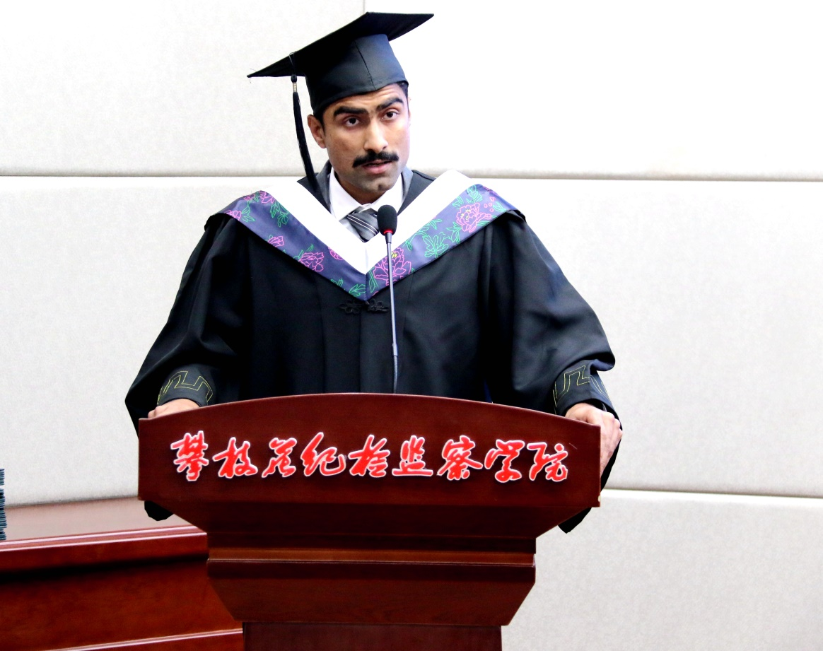 毕业学生李小龙代表2017级全体同学表达了对母校培养的感激之情,他从回忆2017年初来攀大时稍有畏惧的感受开始,讲诉了过去6年的学习和生活中的收获,收获了来自学校每一位领导、老师和同学的关心和帮助,攀大是留学生们心中的第二故乡。
