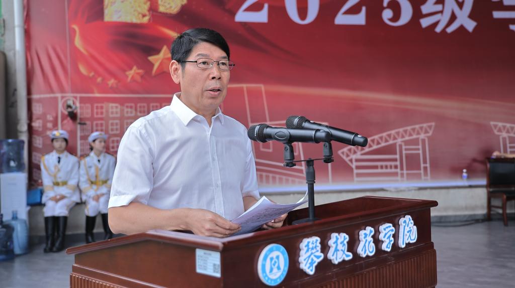党政办、宣传部、教务处、武装部、保卫处、后管处、体育部、团委负责人,各学院党组织书记、分管学生工作领导、学生科长、新生辅导员,学生教官、2025级全体新生参加大会。