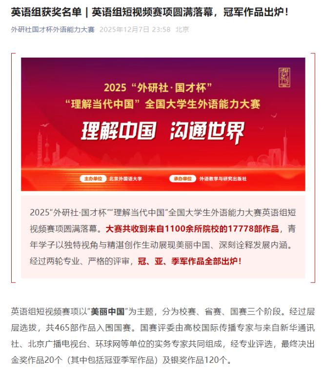 12月5日-8日,2025年“外研社·国才杯”“理解当代中国”全国大学生外语能力大赛全国总决赛在北京举行,我校外国语学院参赛团队(团队成员:祝定逸、高科、陈帆、胡安乔;指导教师:严艳、刘小宇、付乔)荣获全国总决赛英语组短视频赛项银奖。外国语学院与基础医学院组成的跨学院团队(团队成员:陶可怡、周欣平;指导教师:严艳、刘小宇、陈怡)荣获全国总决赛英语组短视频赛项铜奖。此次获奖实现我校学子在该项比赛全国总决赛中获奖零的突破。