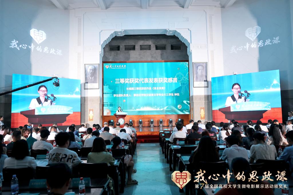 2024年6月14日晚,由教育部社会科学司指导、教育部高校思想政治理论课教学指导委员会主办、武汉大学马克思主义学院承办的第七届“我心中的思政课”全国高校大学生微电影展示活动颁奖典礼在武汉大学樱顶老图书馆隆重举行。马克思主义学院《食全食美》学生创作团队负责人、文学院钟悦受邀参与此次颁奖典礼并代表三等奖获奖团队发表感言。