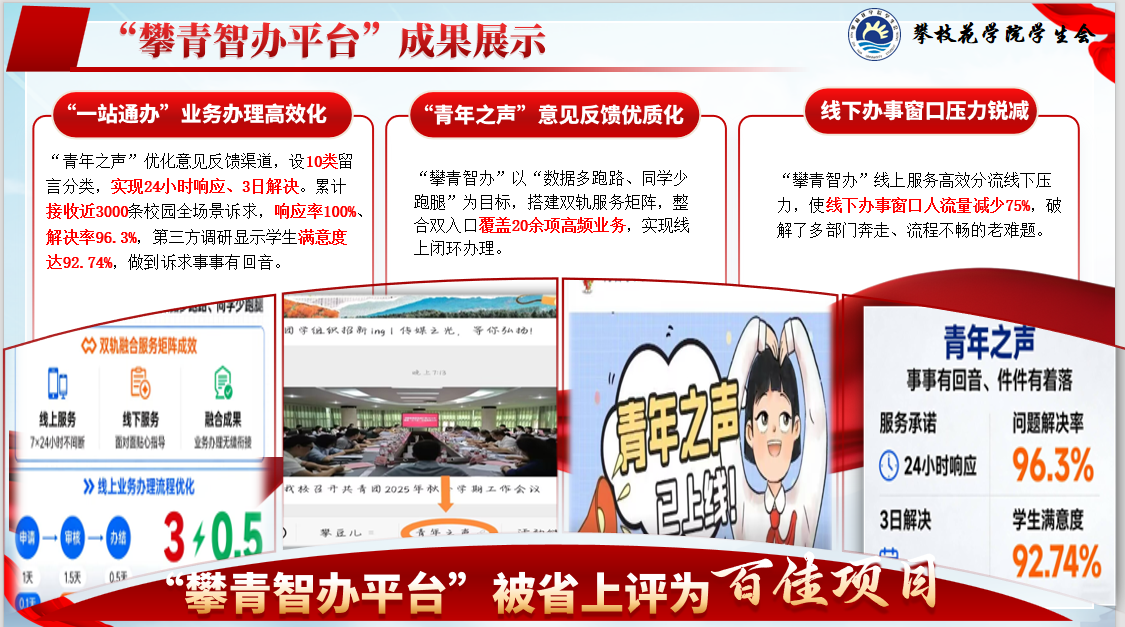 本次活动汇聚全省200余所学校的381个优质服务项目同台竞技,经前期推选、现场答辩等多轮严格遴选,最终我校“攀青智办”项目在众多项目中脱颖而出。
