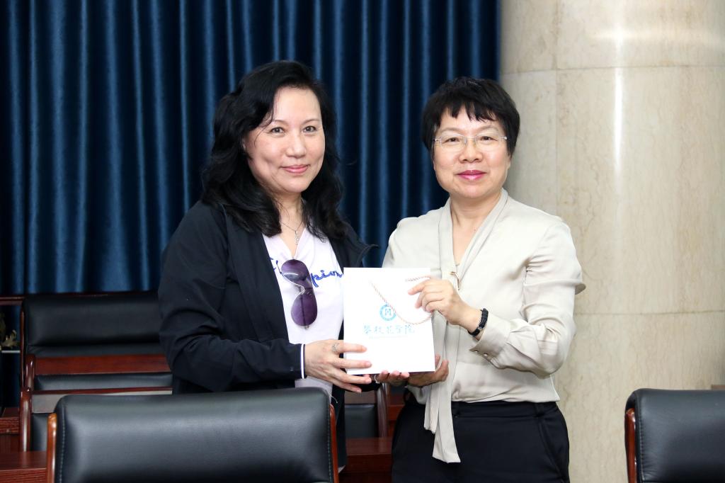 马晓凤和王斌分别向方小榕夫妇赠送了钒钛印章、建筑设计用多功能卷尺等特色纪念品。