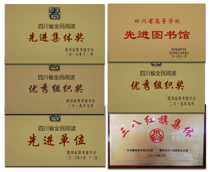 五年来,图书馆贯彻落实学校第二次党代会精神,紧紧围绕“申硕”“更名”“三步走”发展目标,探索形成“资源育人、服务育人、文化育人、环境育人”四位一体育人阵地建设与发展模式,助力学校应用型一流大学建设,举措有力、工作扎实、成效卓著。五年来,图书馆先后荣获“四川省高等学校先进图书馆”、“2016年四川省全民阅读先进单位”、“2017年四川省全民阅读优秀组织”、“2018年四川省全民阅读优秀组织”、“2019年四川省全民阅读先进单位”、“攀枝花市三八红旗手(集体)”荣誉称号。