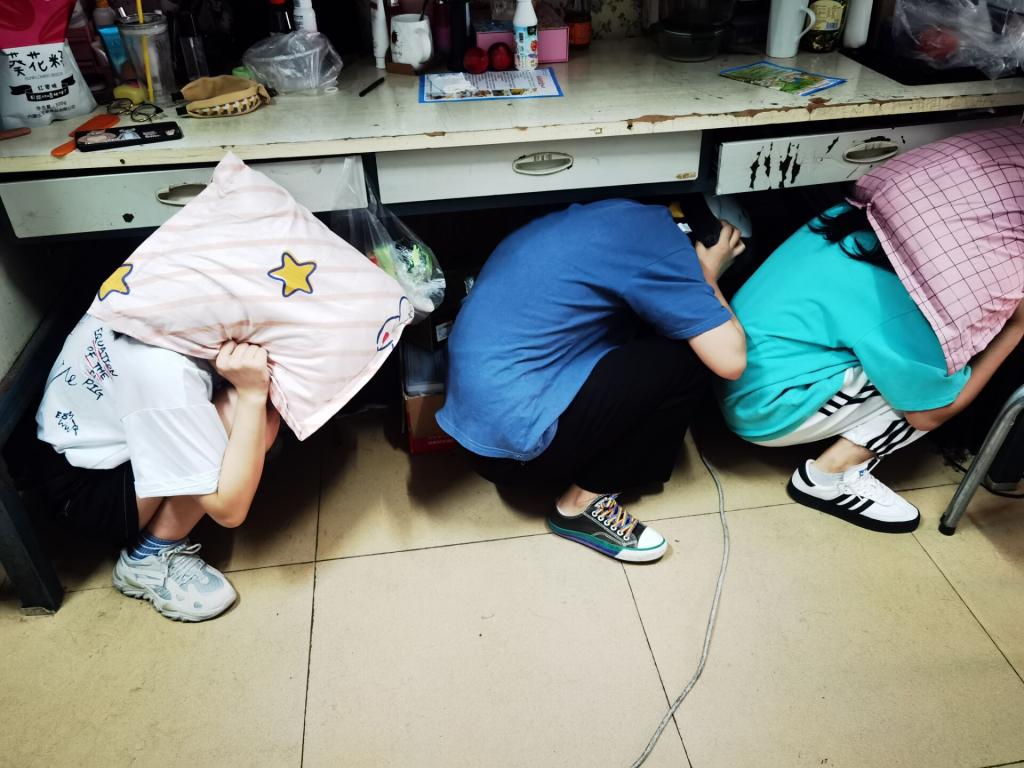 第一次地震波到达,学生在各二级学院教师、志愿者、公寓管理员的指导下采取躲在桌下、三角区,用书包等柔软物品保护头部等措施避险进行就地避险。