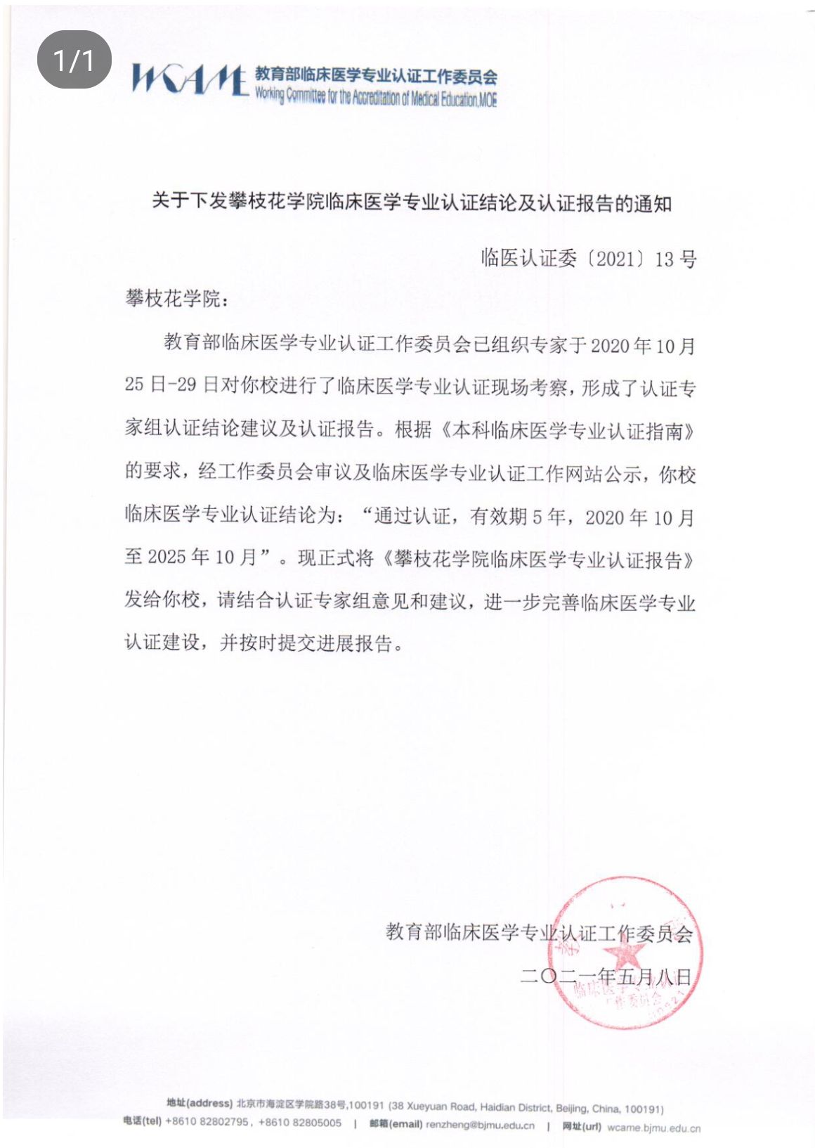 近日,教育部临床医学专业认证工作委员会正式向我校下发《下载香港宝典2021临床医学专业认证报告》,认证结论为:通过认证,有效期5年,2020年10月至2025年10月。