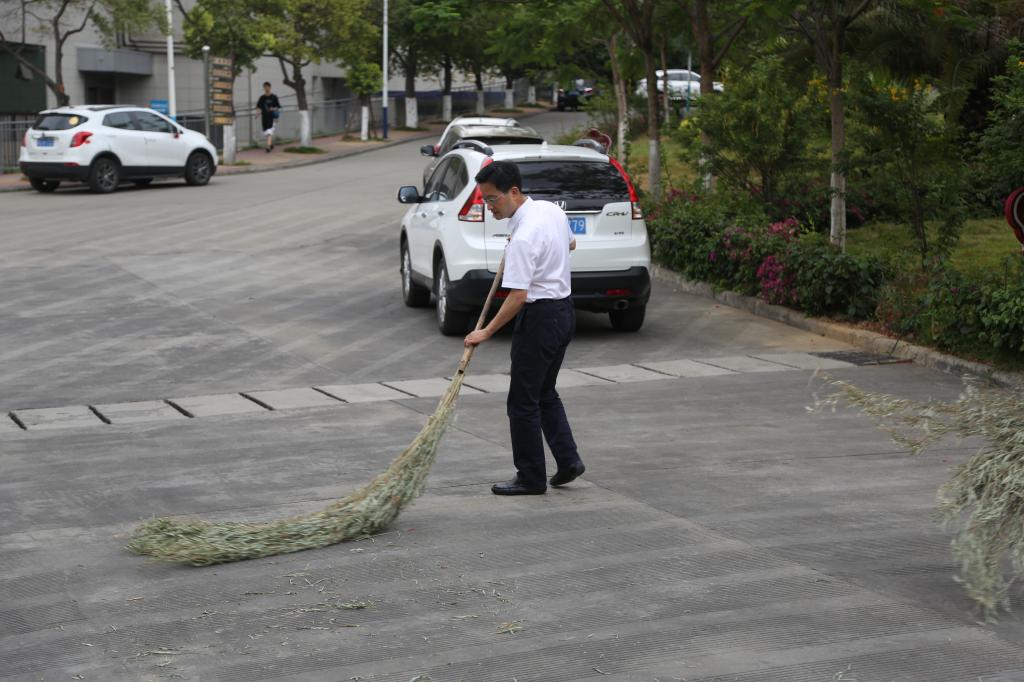 启动仪式结束后,各二级学院有序组织参会师生到本学院公共卫生区域开展劳动。王斌带领机关职能部门积极投入到学校卫生清理劳动。
