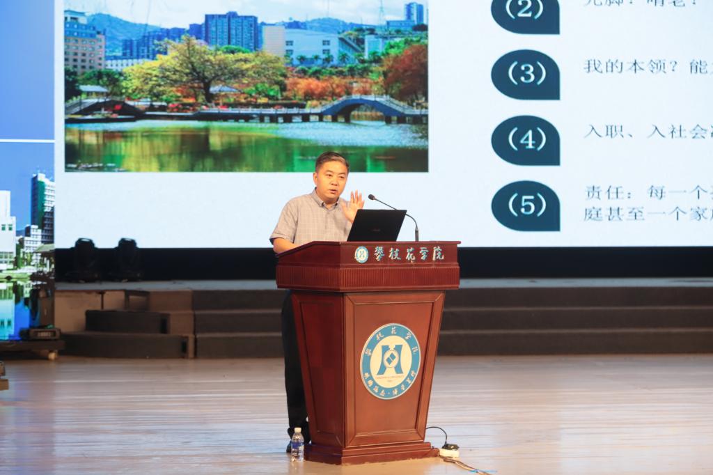 副校长王兵作“职场角色内涵”专题讲座。他强调,毕业生要首先摸清现状,掌握已知条件,树立信心,做好个人精准定位,保持阳光、健康、正能量,踏实做人、自律自强,从“争取做个好人”到“必须做个好人”,正确掌握处理人际社交“先人后己,乐于奉献”的法宝。
