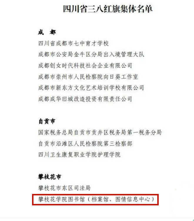 在“三八”国际劳动妇女节来临之际获悉,我校图书馆(档案馆、图情信息中心)(简称图书馆)荣获2021年度四川省“三八红旗集体”表彰。