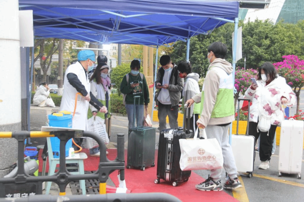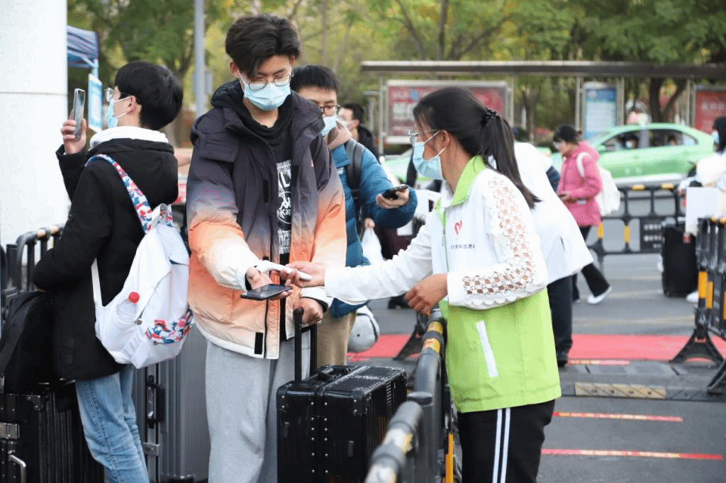 返校期间,同学们按照“分批开学,错峰返校”的原则,分期分批有序返校。返校同学在志愿者的指引下间隔排队,核实身份、查验健康码、测量体温、消毒行李物品,经过严格的防控检查流程平安、健康、卫生地进入校园。
