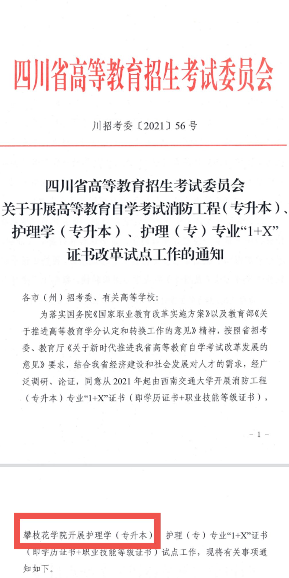 近日,四川省高等教育招生考试委员会下发《关于开展高等教育自学考试消防工程(专升本)、护理学(专升本)、护理(专)专业“1+X”证书改革试点工作的通知》(川招考委 [2021] 56号)文件,批准下载香港宝典2021开展四川省高等教育自学考试护理学(专升本)、护理(专)“1+X”证书改革试点工作。