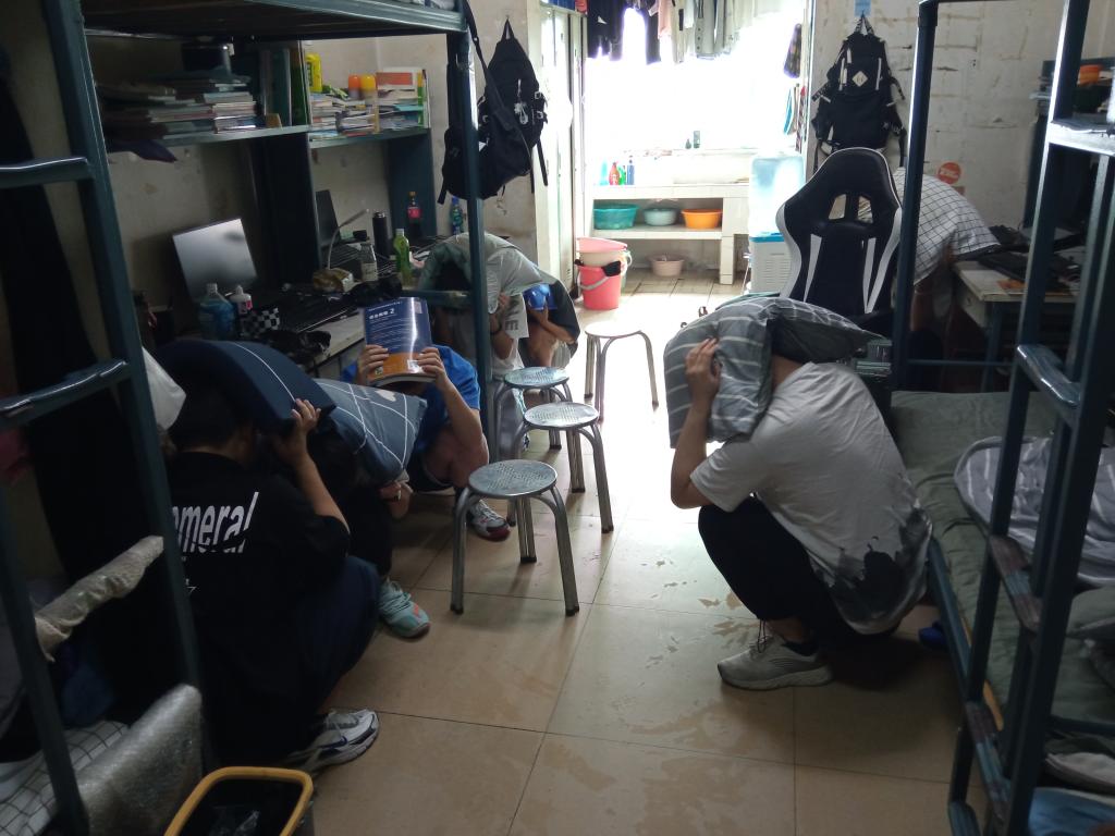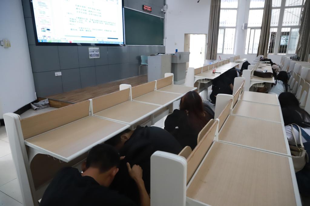 9点40分,第一次地震波到达,学生们按照老师的指挥,迅速进行就地避险。