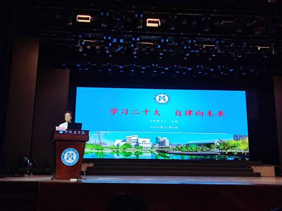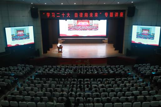 为深入学习宣传贯彻党的二十大精神,引领全校师生,特别是广大青年感党恩、听党话、跟党走,11月9日下午,党委书记王斌在会堂举办“学习二十大,自律向未来”专题讲座,并在15个分会场同步进行直播。2022级全体学生、学工部、宣传部、教务处、团委全体成员,各二级学院相关负责人和师生代表4000余人现场聆听了讲座。