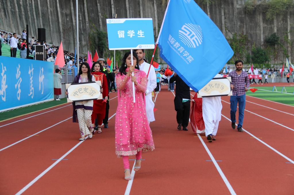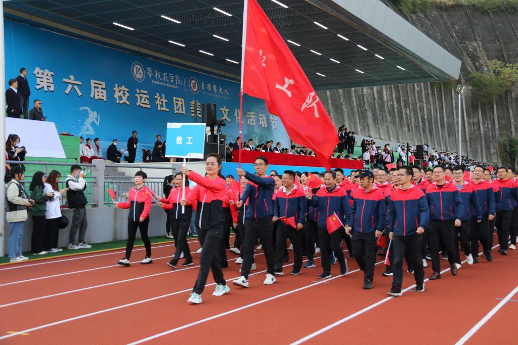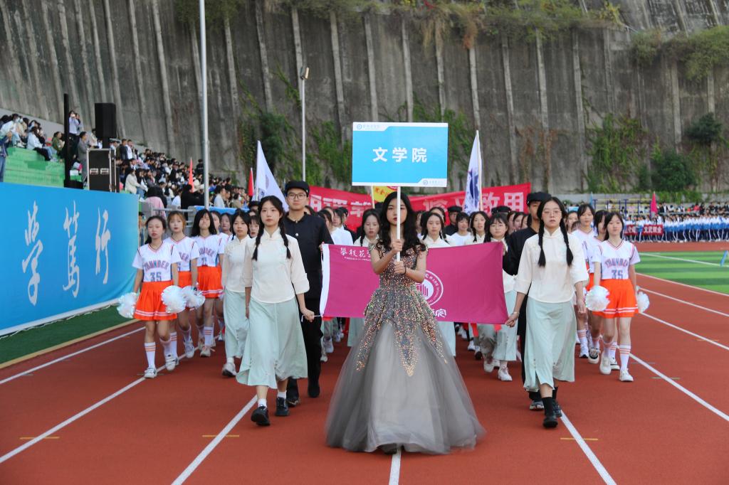 伴随着雄壮激昂的音乐,国旗校旗会旗队、彩旗方队、管乐队方队、裁判员方队、教工代表方队、校友方队、研究生方队、留学生方队、各二级学院学生方队依次进入运动场,精神抖擞,意气风发,阔步经过主席台接受校领导的检阅。自律攀大人以整齐划一锵铿有力的步伐、高亢嘹亮的口号向我们展现他们昂扬的精神风貌和蓬勃的朝气与活力。