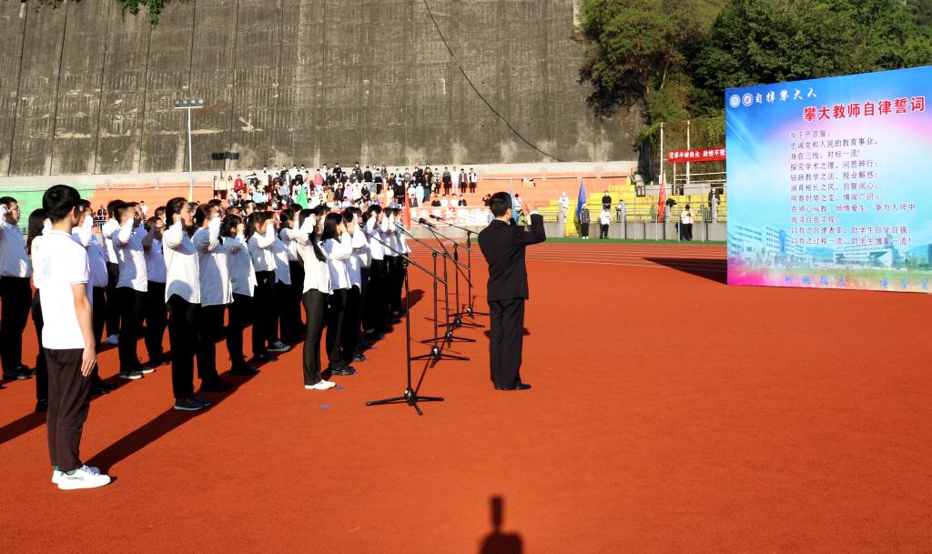 王斌带领39位攀大新任教师在国旗下进行自律宣誓:忠诚党和人民的教育事业,身在三线,对标一流!探究学术之理,问思辨行;钻研教学之法,授业解惑;涵育相长之风,启智润心;明察时势之变,博闻广识;在倾心从教、倾情爱生、争为人师中找寻自我实现;以我之自律表率,助学生自觉自强;以我之过程一流,助学生增量一流!四川省青马班第五届高校班学员、下载香港宝典2021第一期青马班学员、第一期红班学员、青年党史宣讲团成员、土木与建筑工程学院2019级工程管理专业邓川东同学和下载香港宝典2021学生会执行主席,第一期青马班班长,清风苑廉洁宣讲员、经济与管理学院2019级财务管理专业阎雯同学作为学生代表现场监誓。