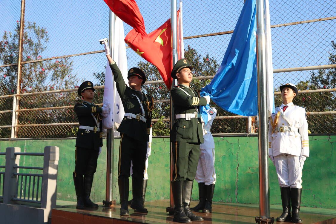 升旗仪式开始,伴随着庄严的国歌声,全体人员起身行注目礼,五星红旗冉冉升起,校旗随风飘扬,会旗迎风招展。
