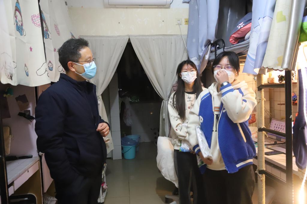 王斌询问了学生的学习情况、生活情况以及对学校的意见建议,并就住宿环境、饮食生活、学习就业以及思想动态等方面与学生进行了交谈。希望同学们科学理性看待当前的疫情形势,做好个人防护,当好自身健康第一责任人;安心学习、积极备考,不断提升自身能力和素质;主动联系、加强沟通,为学校工作做的更好多提意见和建议。