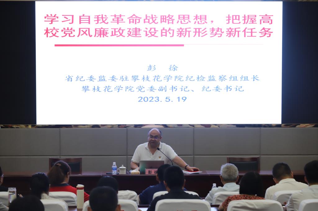 为推进习近平新时代中国特色社会主义思想主题教育和纪检监察干部队伍教育整顿工作走深走实,5月25日下午,党委副书记、纪委书记彭徐在C区纪检监察学院教室,以《深刻领悟自我革命战略思想,把握四川高校党风廉政建设的形势和任务》为题讲授主题教育专题党课。专兼职纪检监察干部,生化学院、法学院师生党员共125人参加党课学习。