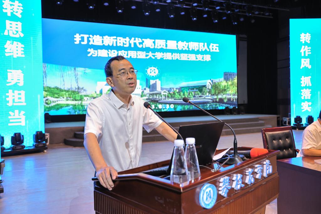 会上,副校长张旭辉重点围绕人才工作,以“打造新时代高质量教师队伍,为建设应用型一流大学提供坚强支撑”为题作专题发言。他重点围绕习近平总书记对教师队伍建设作出的系列重要指示批示,深入解读了新时代高校教师队伍建设的新要求,全面分析了“十四五”以来学校教师队伍建设取得成效与挑战。他指出,要通过着力加强师德师风建设、分类开展示范性培训、关心关爱教师成长、抓实做细人才“引育留用”,进一步强化思想政治建设、优化教师队伍结构,不断提升教学教学能力,充分发挥高层次人才作用,逐步增强教师获得感、幸福感及安全感,为学校发展提供有力的人才支撑。