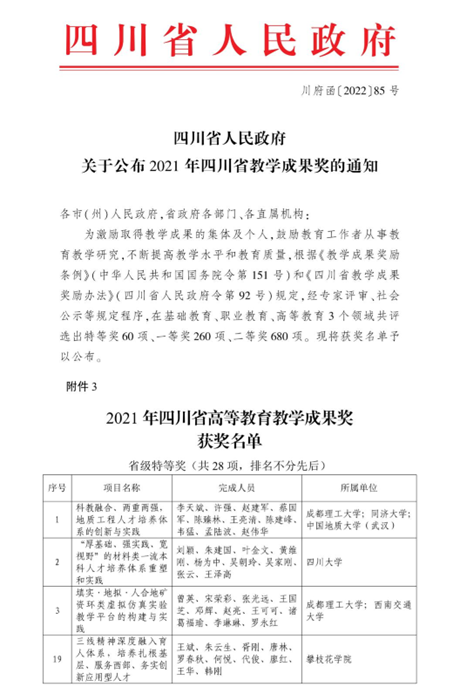 学校扎实推进教育教学改革,加强谋划、找准定位、凝聚共识、形成合力。2000年至今,共获省级教学成果奖17项,其中在2021年教学成果奖评选中,获得省级教育教学成果奖4项、其中特等奖2项(含参与1项)、二等奖2项,我校作为唯一完成单位申报的《三线精神深度融入育人体系,培养扎根基层、服务西部、务实创新应用型人才》荣获四川省教育教学成果特等奖,实现了历史性突破。