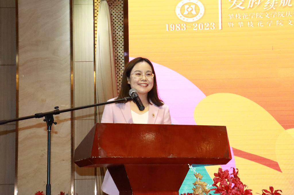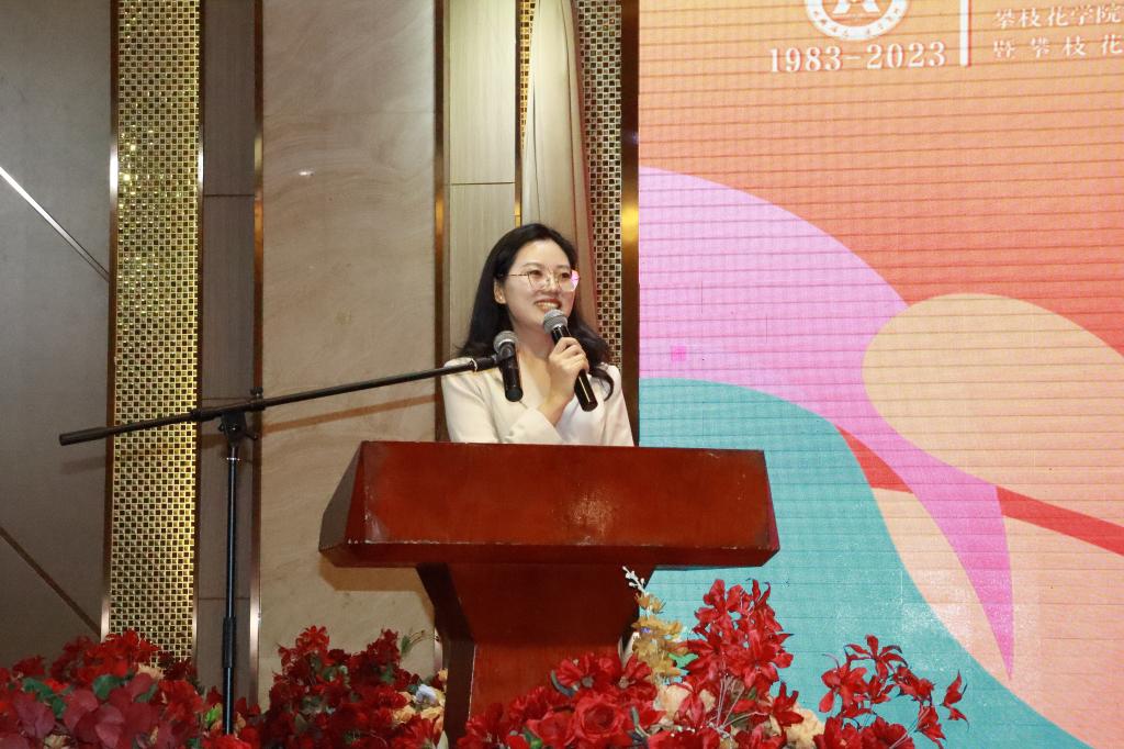 2014届汉语言文学专业校友、攀枝花市建筑工程学校教师秦瑶作为校友代表发言。她表示是文学院的老师们坚定了她从事教育行业的决心,成立文学专业校友分会是为了学之传承、爱之赓续,搭建了共叙友情、平等交流、重温师恩、回报母校的良好平台,期待未来能与校友们分享资源,传递友情和价值,共同助力文学专业校友会建设发展,为母校发展贡献力量。