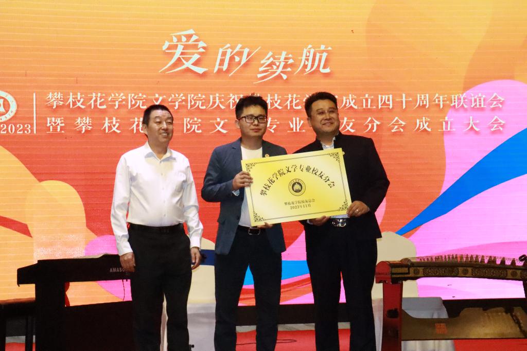 文学院党总支副书记(主持工作)汪大喹为文学专业校友分会授牌,第一届理事会会长张旭斌和秘书长蔡华接牌。