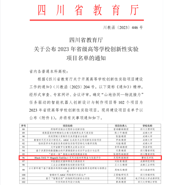 近日,四川省教育厅下发了《关于公布2023年省级高等学校创新性实验项目名单的通知》(川教函〔2023〕446号),经形式审查、专家网评、会议评审,全省共立项102个项目,我校钒钛学院吴恩辉老师作为负责人的项目《Black-TiO2和Magnéli-TinO2n-1系列功能材料制备与性能评价》成功获批。