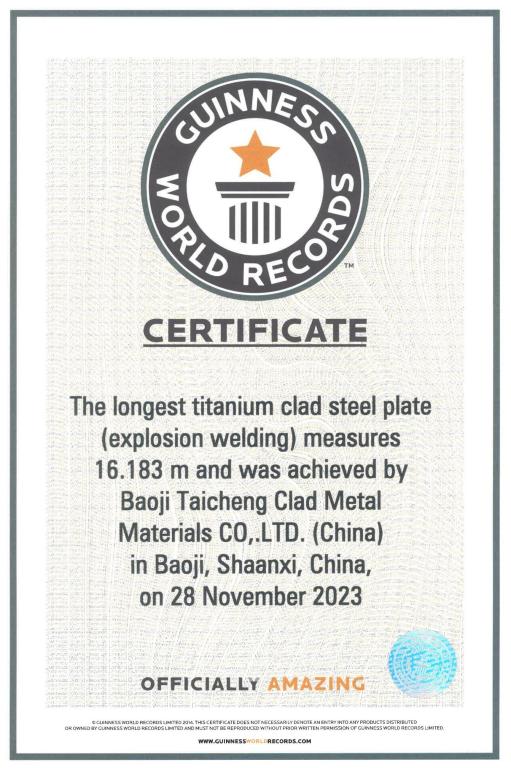 近日,钒钛学院张雪峰教授团队与四川钛程钛业有限公司合作研发的爆炸成型制备大规格钛钢复合板成功挑战吉尼斯世界纪录,获得“最长的钛钢复合板(爆炸成型)”吉尼斯世界纪录称号。