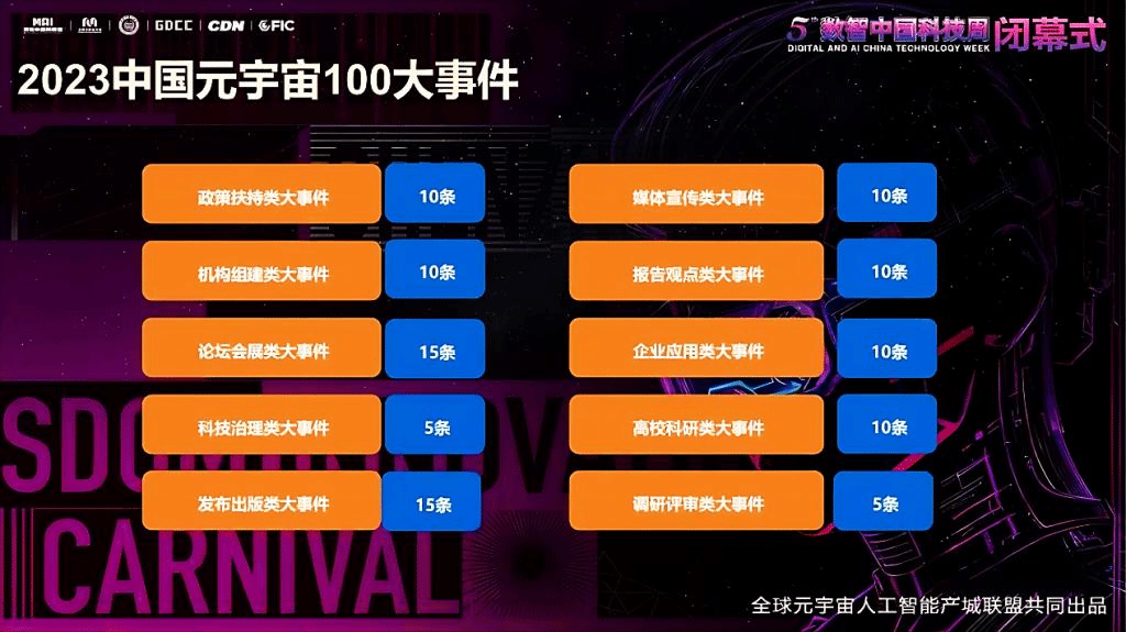 2023中国元宇宙100大事件是由北京信息产业协会、中国移动通信联合会指导,北京信息产业协会元宇宙专委会、全球元宇宙大会产城联盟发起,由南京信息工程大学、国家超级计算长沙中心、北京工业大学元宇宙云图智能研究院等多个单位或机构支持发起,按内容分为十大类,分别是:政策扶持类大事件、机构组建类大事件、论坛会展类大事件、科技治理类大事件、发布出版类大事件、媒体宣传类大事件、报告观点类大事件、企业应用类大事件、高校科研类大事件、调研评审类大事件。