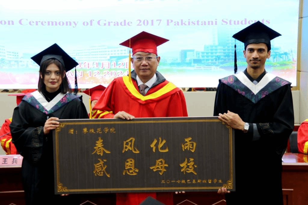 教师代表医学院李瑞丰老师回顾了同学们在校学习期间的学习转变和生活点滴,她寄语同学们以毕业为新的起点,持续学习,不断进取,心怀感恩,为巴基斯坦人民做出贡献,让更多的人了解中国、认识中国。