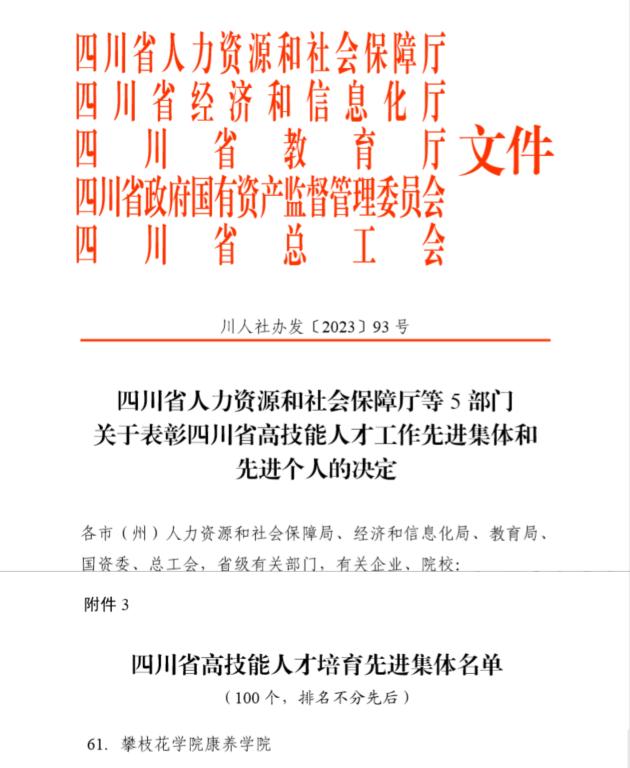 近日,四川省人力资源和社会保障厅等5部门联合发布了《关于表彰四川省高技能人才工作先进集体和先进个人的决定》,我校康养学院荣获“四川省高技能人才培育先进集体”称号。