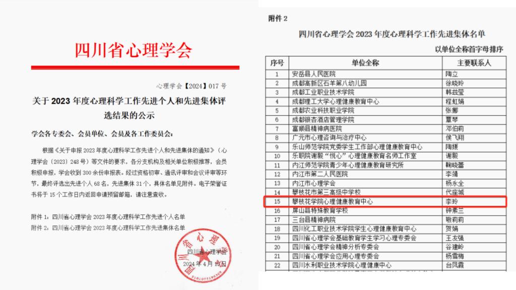 近日,为表彰在2023年度心理学科工作成绩突出,心理健康教育工作育人效果显著,并在行业内有一定影响力的集体和个人,四川省心理学会发布了《关于2023年度心理科学工作先进个人和先进集体评选结果的公示》(心理学会〔2024〕017号),评选出先进个人68名,先进集体31个。我校心理健康教育中心荣获先进集体荣誉称号。