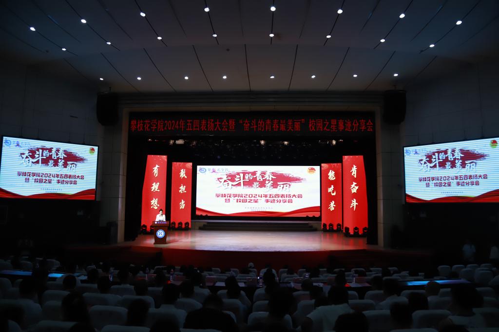 5月6日下午,我校在会堂举行2024年“五四”表扬大会暨“奋斗的青春最美丽”校园之星事迹分享会。校党委副书记刘立新,相关职能部门负责人,各二级学院党组织书记、分团委书记及师生代表共计1000余人参会。
