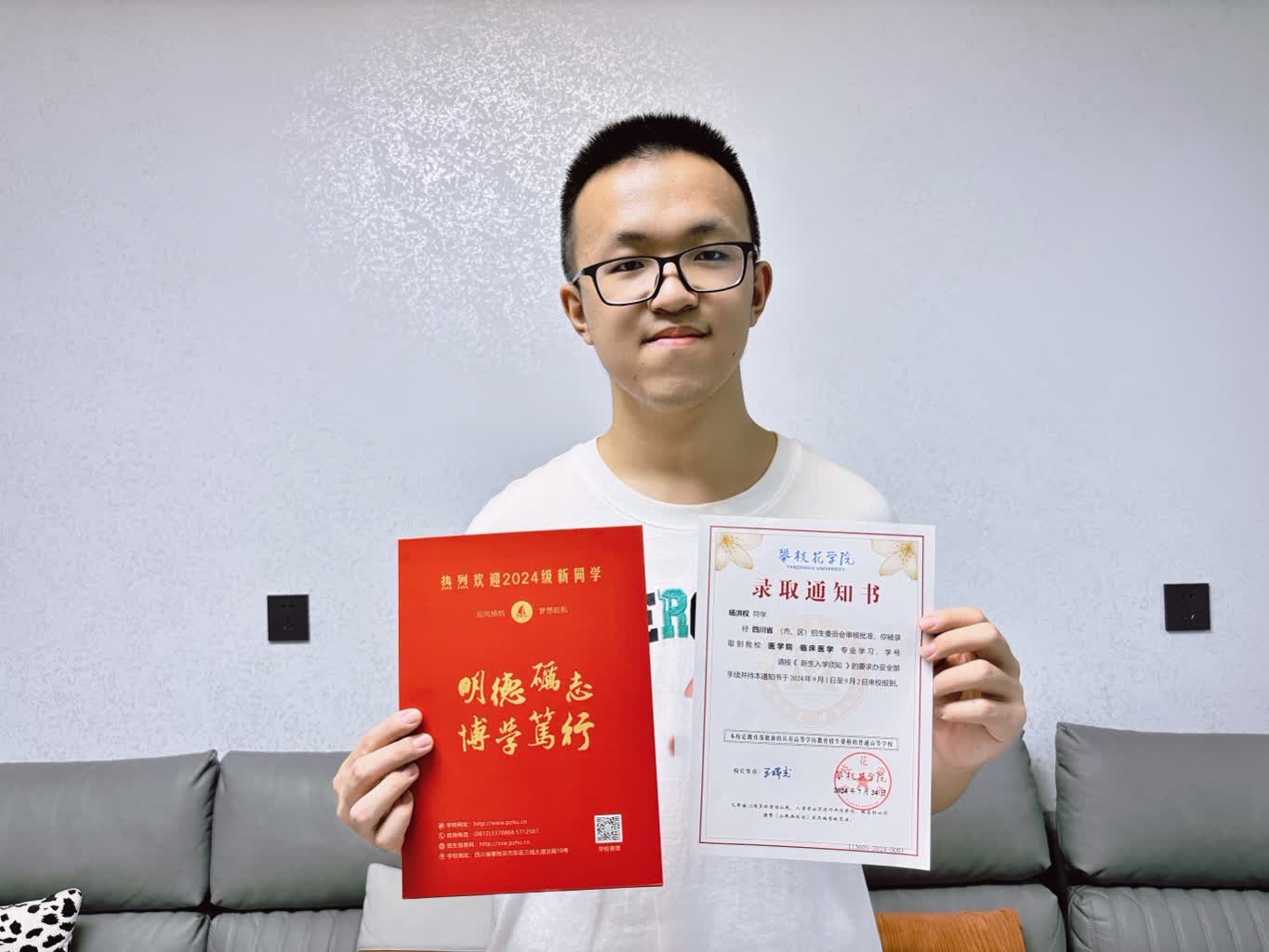 7月24日下午,学校党委书记胥刚带领招生就业处相关同志,将编号为20240001号的我校2024年第一份学生录取通知书(本科一批次:临床医学专业)送达攀枝花学子杨洪权家中。