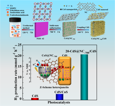 论文《Rationaldesign of Z-scheme CoS@NC/CdS heterojunction with N doped carbon (NC) as anelectron mediator for enhanced photocatalytic H2 evolution》以结构新颖的Co基金属有机框架PZH-42为牺牲剂模版构建了氮掺杂碳(NC)作为电子传输桥的Z型异质结光催化剂CoS@NC/CdS,由于NC快速的电子传输能力以及Z型异质结优异的还原能力,显著提升了光催化产氢活性。