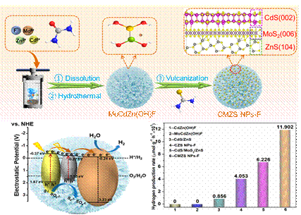 论文《Stepped fluorinated CdS/MoS2/ZnS nanoparticlesconstructed on a multifunctional platform with Zn(OH)F nanoflowers for highlyactive photocatalytic H2 production》基于光生载流子转移的形态工程和通道构建技术设计合成了高效产氢光催化剂CMZS NPs-F。通过Zn(OH)F多功能平台限制CdS/ZnS NPs的生长,F-离子加速载流子界面转移,MoS2加速光生电荷的快速捕获和转移,促使产氢速率显著提高。