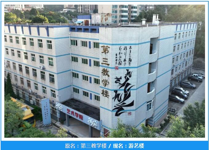教学楼均以“学”字贯之,分别取“志学、尚学”“勤学、劝学”(志于学、尚于学、勤于学、勉于学);因第三教学楼集艺术学院办公、教学为一体,取其院训“游于艺”命名为“游艺楼”。