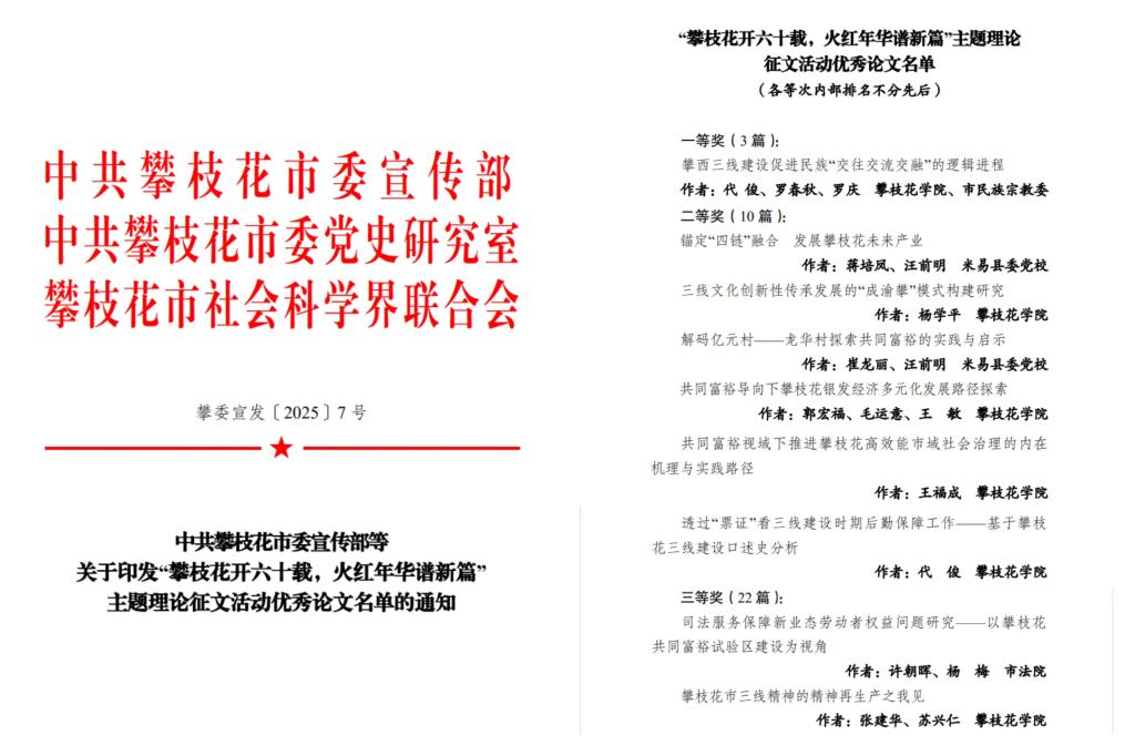 近日,中共攀枝花市委宣传部、中共攀枝花市委党史研究室、攀枝花市社会科学界联合会公布了“攀枝花开六十载,火红年华谱新篇”主题理论征文活动优秀论文名单。我校教师获一等奖1项,二等奖4项,三等奖2项。