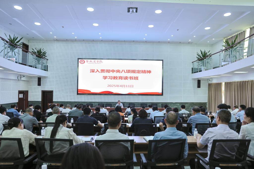 4月11日下午,我校在图书馆博雅厅举行深入贯彻中央八项规定精神学习教育读书班开班仪式。党委书记胥刚主持会议并讲话。校领导班子成员、全体中层干部参加学习,校学习教育工作专班成员列席会议。