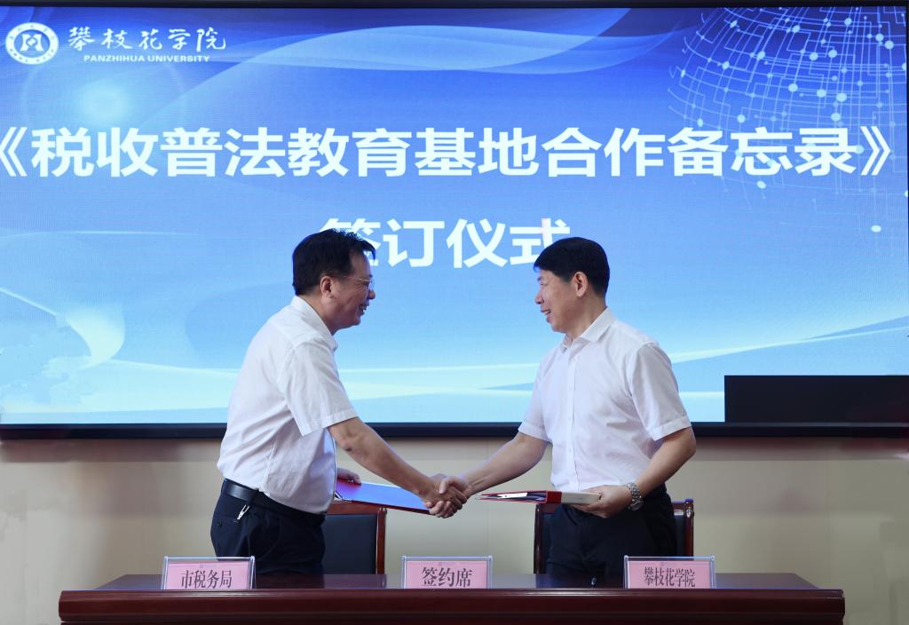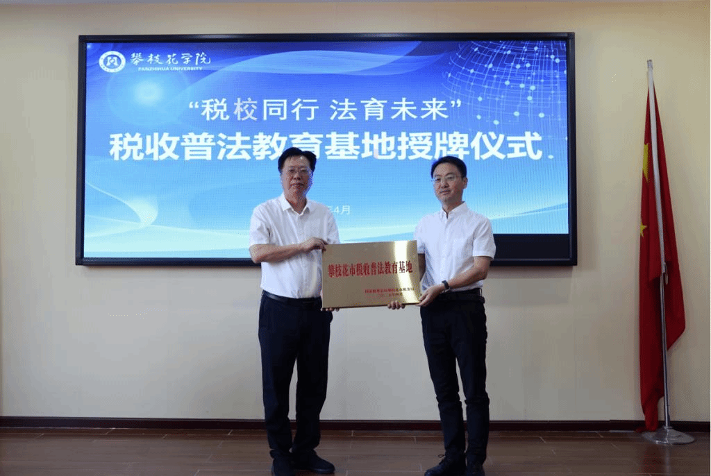4月28日上午,我校与国家税务总局攀枝花市税务局在励志楼201举行“税校同行 法育未来”税收普法教育基地授牌仪式。副校长朱云生,国家税务总局攀枝花市税务局党委委员、总会计师、机关党委书记、我校1995届优秀校友刘明出席仪式,税收普法宣传人员、师生代表参加仪式。