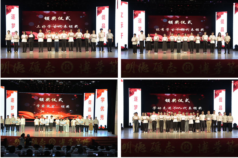 会上,还分别对学霸寝室、国家励志奖学金、国家奖学金、优秀学生干部、三好学生、劳动先进个人、校级优秀大学毕业生、省级优秀大学毕业生8种不同类型的优秀学生进行表扬。