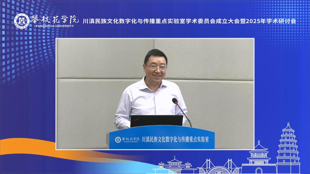 李兴贵代表学校致辞,他指出,实验室于2024年入选省级哲学社会科学重点实验室,标志着我校在人文社科领域迈上了新的台阶。学校将持续加大投入,开展有组织科研,力争在民族文化数字化传播、文化遗产数字化保护等方向形成具有示范意义的“攀大方案”。同时扩大与川滇六市州合作,依托实验室打造产教融合示范基地,为民族地区输送兼具文化底蕴与技术能力的应用型人才。