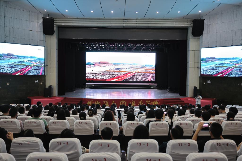 9月3日上午,纪念中国人民抗日战争暨世界反法西斯战争胜利80周年大会在北京天安门广场隆重举行,中共中央总书记、国家主席、中央军委主席习近平发表重要讲话并检阅部队。为共同见证这一铭刻历史记忆和彰显强国风采的重要时刻,学校在阳光会堂、图书馆博雅厅、教室等地设立直播观看会场,积极组织广大师生集中观看纪念大会。大会结束后,师生们心潮澎湃、满怀自豪,纷纷结合学习工作生活,畅谈心得体会,展开热烈讨论。