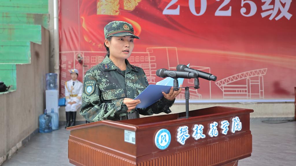 经济与管理学2025级的优秀学员严甜代表全体参训新生发言。她表示,军训完成“学生”到“成长者”升级,今后将把训练养成的好作风带进学习与生活,尽快适应大学节奏。