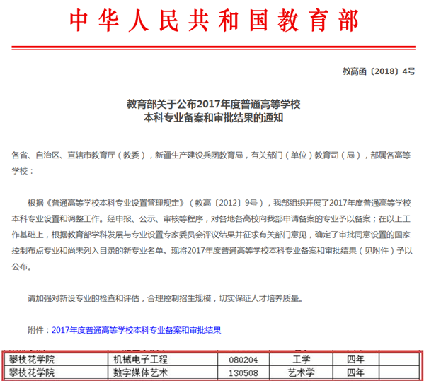 3月21日,教育部公布了《2017年度普通高等学校本科专业备案和审批结果的通知》(教高函〔2018〕4号),我校申报的机械电子工程学(专业代码:080204)和数字媒体艺术(专业代码:130508)两个本科专业成功获得教育部备案和审批。至此,我校本科专业已达54个,涵盖经济学、法学、文学、理学、工学、农学、医学、管理学、艺术学9大学科门类。