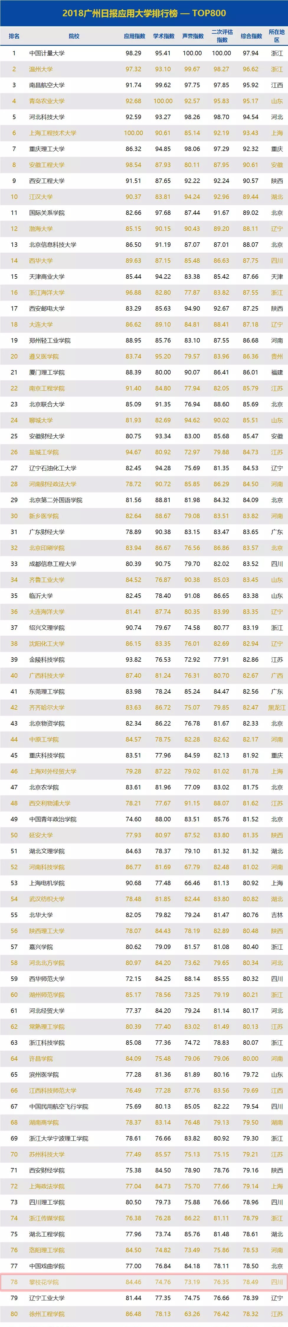 该榜是国内首个全样本应用大学排行榜,也是权威媒体作为第三方评估、发布的专业性公益榜单。GDI智库以应用指数、学术指数、声誉指数、二次评估指数四个一级指标建构综合指数,科学评价国内872所本科院校(非博士培养单位),推出“2018广州日报应用大学排行榜—TOP800”以及“独立学院TOP100”、“民办本科高校TOP100(不含独立学院)”等四个子榜单。