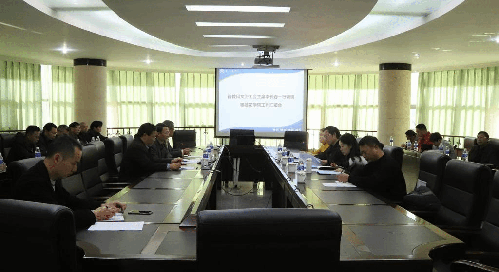 李长春一行实地走访了我校国家钒钛检测重点实验室、在建的产教融合大楼、校史馆等地,随后在四楼会议室听取了工会工作汇报。在汇报会上,朱波强首先对李长春主席一行莅临我校检查指导工作表示了热烈的欢迎,对省教科文卫工会长期以来对我校工会工作的关心和支持表示衷心感谢。在简要介绍我校情况后,朱波强从思想政治引领、营造良好政治生态、助推精神文明建设、财务规范化建设、建设和谐幸福攀大等五个方面做了详细汇报,提出了下一步工作举措。